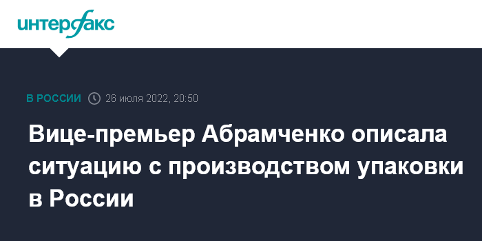 Москва. 26 июля. INTERFAX.RU - Российские сельхозпроизводители и переработчики будут полностью обеспечены упаковкой для своей продукции, заверила вице-премьер Виктория Абрамченко после того, как Tetra Pak объявила об уходе из России.