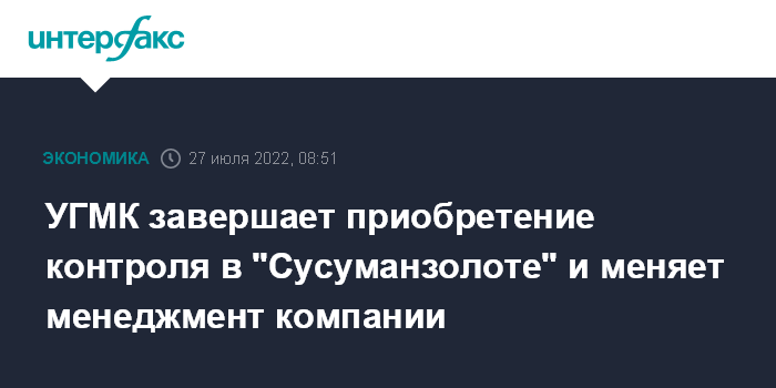 Москва. 27 июля. INTERFAX.RU - "Уральская горно-металлургическая компания" (УГМК) завершает приобретение контрольного пакета золотодобытчика "Сусуманзолото", выкупив доли наследников его основателя Владимира Христова, и меняет менеджмент предприятия. Об этом пишет в среду "Коммерсантъ" со ссылкой на свои источники.
