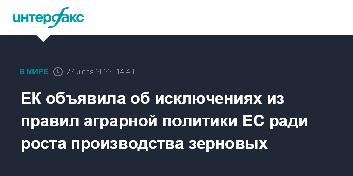 Москва. 27 июля. INTERFAX.RU - Еврокомиссия (ЕК) объявила, что по просьбе государств-членов ЕС утвердила в среду "временные краткосрочные" исключения из правил чередования посадок сельскохозяйственных культур (севооборота) и частичного поддержания на пашнях непродуктивной растительности.