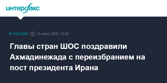 Москва. 16 июня. INTERFAX.RU - Все участники состоявшегося в Екатеринбурге саммита Шанхайской организации сотрудничества поздравили Махмуда Ахмадинежада с переизбранием на пост президента Ирана, сообщила во вторник "Интерфаксу" пресс-секретарь российского президента Наталья Тимакова.