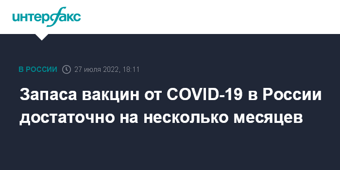 "Запасов вакцин от коронавируса в России достаточно, риски дефицита препаратов в настоящее время отсутствуют, следует из данных Национальной системы цифровой маркировки "Честный знак" (...) В прививочных пунктах и на складах на 27 июля находится более 26 миллионов доз вакцин, почти 10% из них - "Спутник Лайт". Совокупных запасов вакцин от COVID-19 хватит на несколько месяцев при текущем потреблении", - говорится в сообщении.
