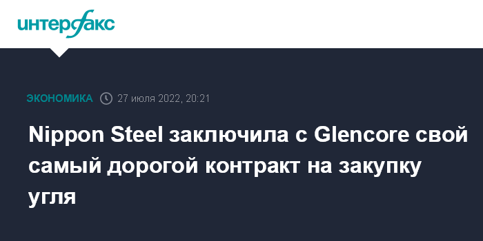 Москва. 27 июля. INTERFAX.RU - Японская сталелитейная компания Nippon Steel Corp. заключила самый дорогой в своей истории контракт на поставку угля с трейдером Glencore Plc. По этому контракту Nippon будет покупать уголь по $375 за тонну до марта следующего года, сообщает Bloomberg со ссылкой источники.