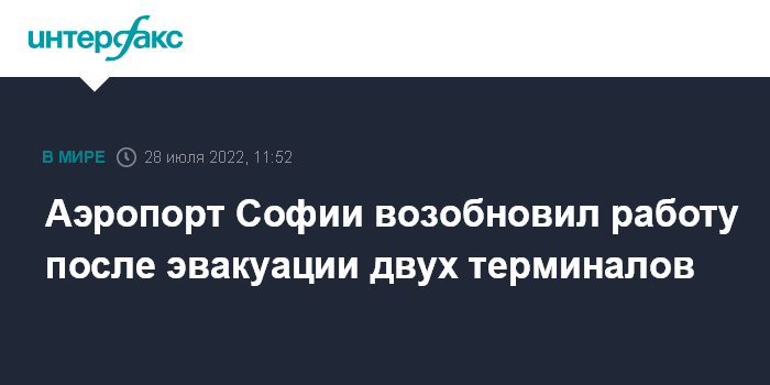 Москва. 28 июля. INTERFAX.RU - Аэропорт Софии вернулся к работе в штатном режиме после эвакуации и проведения проверки по сигналу о возможном минировании. Бомб на предприятии не нашли, сообщило Болгарское национальное телевидение.
