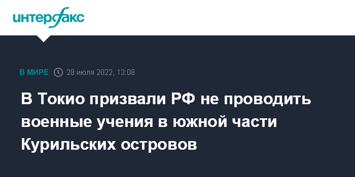 Москва. 27 июля. INTERFAX.RU - Японские власти считают необходимым для РФ исключить южную часть Курильских островов из зоны готовящихся учений "Восток-2022". Об этом сообщают в четверг западные СМИ со ссылкой на заместителя генсека кабмина Японии Ёсихико Исодзаки.
