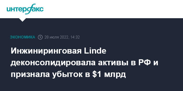 "Несколько юрисдикций, включая Европу и США, ввели несколько траншей экономических санкций против России. В результате Linde провела переоценку своей способности контролировать свои российские дочерние компании и определила, что с 30 июня 2022 года она больше не может осуществлять контроль над этими предприятиями. Таким образом, 30 июня 2022 года компания Linde деконсолидировала свои российские газовые и инжиниринговые предприятия", - говорится в отчете Linde.