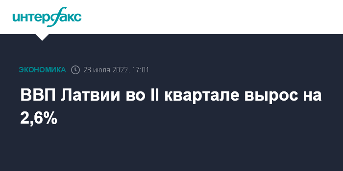 Москва. 28 июля. INTERFAX.RU - Во втором квартале 2022 года ВВП Латвии без учета сезонных и календарных факторов вырос на 2,6% по сравнению с соответствующим периодом 2021 года, показывают предварительные оценки Центрального статистического управления (ЦСУ).