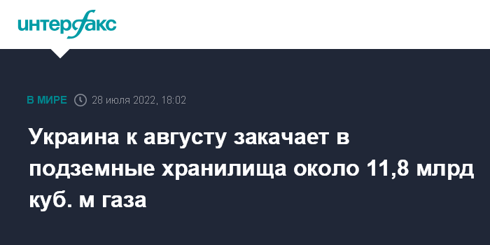 Как сообщалось, Украина по состоянию на середину июля располагала в ПХГ 11,3 млрд куб. м природного газа. Перед "Нафтогазом" поставлена задача накопить в ПХГ 19 млрд куб. м к началу отопительного сезона 2022/2023 годов.