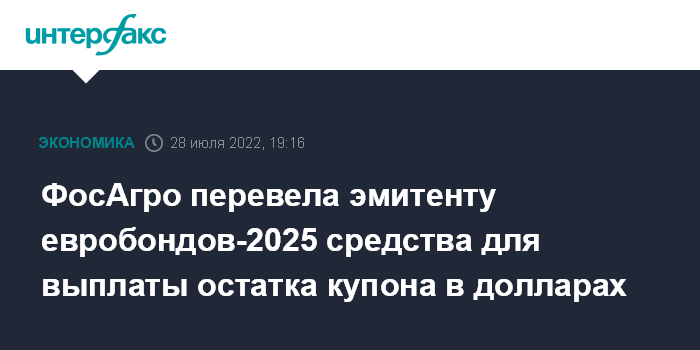 ФосАгро перевела эмитенту евробондов-2025 средства для выплаты остатка купона в долларах