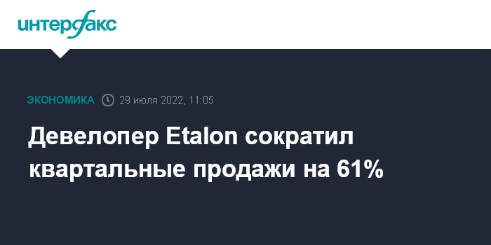 Москва. 29 июля. INTERFAX.RU - Девелопер Etalon Group во II квартале 2022 года сократил продажи на 61% в годовом измерении, до 9,638 млрд рублей, говорится в сообщении компании.