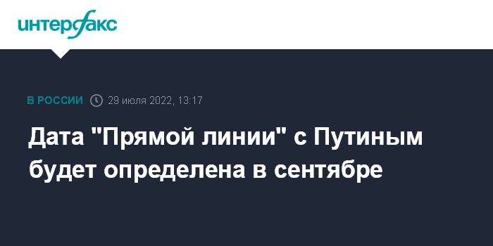 "Время будет определено. "Прямую линию" в связи с напряженным графиком мы в начале лета не успели провести. Сейчас все-таки период отпускной у очень многих людей, поэтому они не смогут наблюдать за этим в том режиме, наверняка, в котором бы хотелось. Начало сентября, первая половина сентября – начало политического сезона, и в целом такое оживление жизни после летнего периода. А потом обязательно будет назначена дата, и мы проинформируем вас соответствующим образом", - сказал Песков, отвечая в пятницу на вопрос журналистов о возможных сроках "Прямой линии".