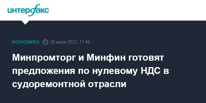 Москва. 29 июля. INTERFAX.RU - Минпромторг и Минфин РФ вскоре могут сформировать единое решение о применении нулевой ставки НДС на услуги по ремонту и обслуживанию судов. Об этом сообщил вице-премьер - министр промышленности и торговли Денис Мантуров журналистам в Петербурге в пятницу.