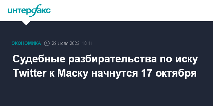 Москва. 29 июля. INTERFAX.RU - Канцлерский суд штата Делавэр назначил на 17 октября начало разбирательств по иску Twitter Inc. к Илону Маску в связи с отказом миллиардера купить сервис микроблогов. Разбирательства должны завершиться в пятидневный срок, пишет The Wall Street Journal.