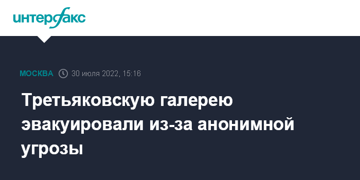 "В связи с анонимной угрозой мы вынуждены эвакуировать посетителей и до 16:00 30 июля прекратить работу музеев Третьяковской галереи по адресу: Лаврушинский переулок, дом 10 и 12, в здании Новой Третьяковки по адресу: Крымский Вал, дом 10", - говорится в сообщении на сайте галереи.