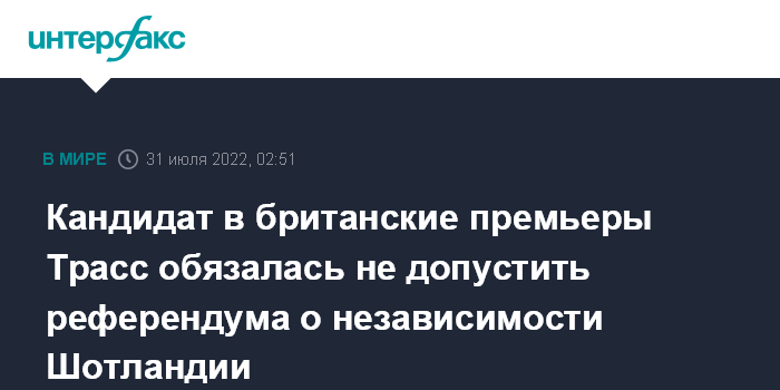 Москва. 31 июля. INTERFAX.RU - Министр иностранных дел Великобритании Лиз Трасс, баллотирующаяся на пост лидера Консервативной партии и, соответственно, в премьер-министры страны, заявила, что в случае ее избрания на этот пост она не допустит повторного референдума о независимости Шотландии.