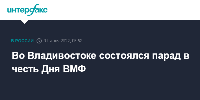Москва. 31 июля. INTERFAX.RU - Торжественный парад кораблей в честь Дня военно-морского флота (ВМФ) России прошел во Владивостоке в бухте Золотой Рог, сообщает пресс-служба Восточного военного округа (ВВО).