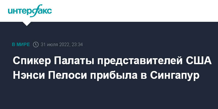 Москва. 31 июля. INTERFAX.RU - Спецборт Boeing C-40C со спикером Палаты представителей Конгресса США Нэнси Пелоси в воскресенье прибыл в Сингапур, следует из данных сервиса Flightradar.