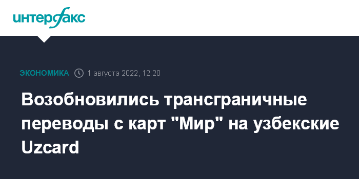 Москва. 1 августа. INTERFAX.RU - В Узбекистане после пяти месяцев перерыва возобновил работу сервис трансграничных переводов с банковских карт "Мир", выпущенных в России, на узбекские карты Uzcard, сообщил общереспубликанский процессинговый центр Uzcard.