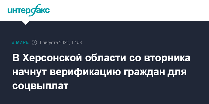 Москва. 1 августа. INTERFAX.RU - Жители Херсонской области смогут получить социальные выплаты и пособия после прохождения процедуры верификации, для этого необходимо предоставить в службу соцзащиты документы украинского или российского образца, сообщила начальник департамента труда и социальной политики временной администрации региона Алла Бархатнова.