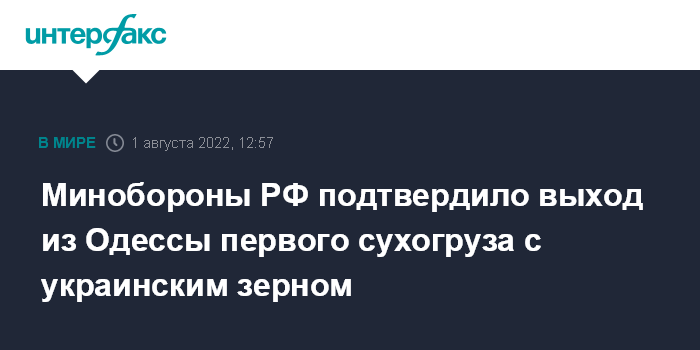 Москва. 1 августа. INTERFAX.RU - В понедельник утром из порта Одессы вышел первый сухогруз с украинским зерном, во вторник он прибудет в Стамбул, заявили в Минобороны России.
