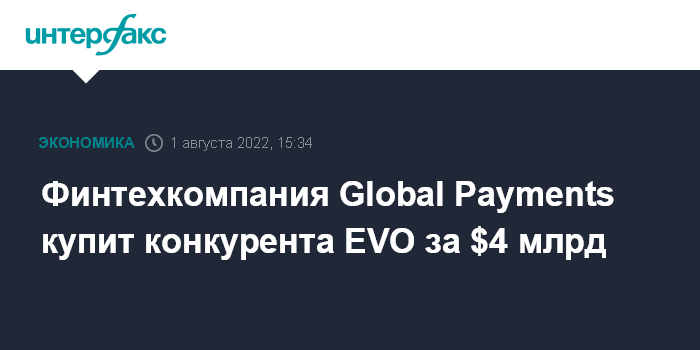 Москва. 1 августа. INTERFAX.RU - Американская финтехкомпания Global Payments, предоставляющая платежные технологии и услуги продавцам, эмитентам и потребителям, купит конкурирующую EVO Payments Inc. за $4 млрд.