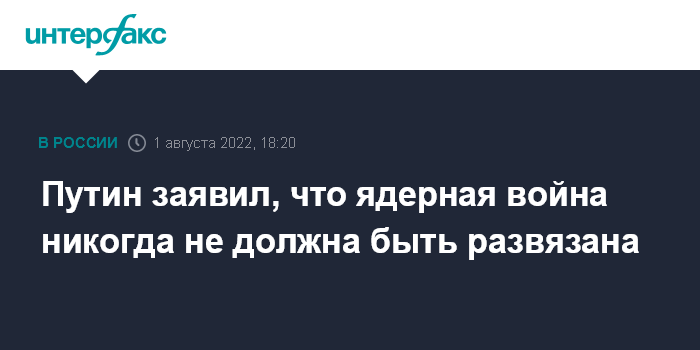 Москва. 1 августа. INTERFAX.RU - Россия исходит из того, что в ядерной войне не может быть победителей и что она никогда не должна быть развязана, заявил президент РФ Владимир Путин в обращении к участникам конференции по рассмотрению действия Договора о нераспространении ядерного оружия (ДНЯО).