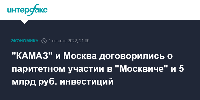 Москва. 1 августа. INTERFAX.RU - ПАО "КАМАЗ" и правительство Москвы договорились о паритетном распределении долей в капитале автозавода "Москвич" (бывшее ЗАО "Рено Россия") и инвестициях в его развитие в размере 5 млрд рублей.