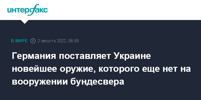 Москва. 2 августа. INTERFAX.RU - Германия поставляет Украине все виды оружия и военной техники, имеющиеся в ее распоряжении, в том числе и новейшие, которые еще не поступили на вооружение Бундесвера, заявил канцлер страны Олаф Шольц.