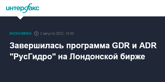 Москва. 2 августа. INTERFAX.RU - Депозитарные расписки ПАО "РусГидро" 2 августа были исключены из списка ценных бумаг, допущенных к торгам на Лондонской фондовой бирже (LSE), сообщила энергокомпания. Речь идет о программе GDR и ADR "РусГидро".
