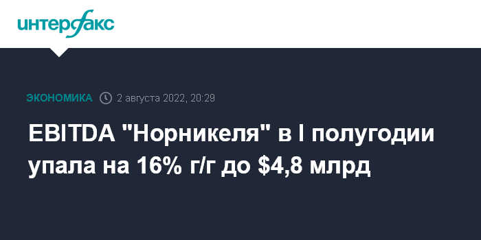 Москва. 2 августа. INTERFAX.RU - EBITDA "Норильского никеля" в первом полугодии 2022 года составила $4,8 млрд, что на 16% ниже уровня годичной давности, сообщила компания.