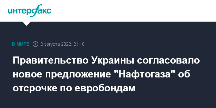 Москва. 2 августа. INTERFAX.RU - "Нафтогаз Украины" в ближайшие дни направит держателям еврооблигаций новое предложение об отсрочке выплат по ним, так как получило соответствующее согласование от правительства, говорится в сообщении компании.