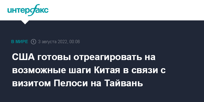Москва. 3 августа. INTERFAX.RU - Представитель Совета национальной безопасности США Джон Кирби заявляет, что Вашингтон не намерен создавать кризисную ситуацию вокруг Тайваня, однако готов реагировать на возможные шаги Пекина.