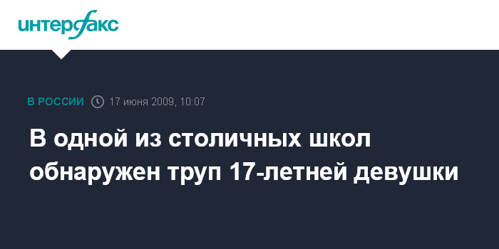 Москва. 17 июня. INTERFAX.RU - На юго-западе столицы в помещении школы в минувший вторник вечером обнаружен труп 17-летней школьницы из подмосковной Щербинки, сообщил "Интерфаксу" в среду источник в правоохранительных органах города. Как рассказал собеседник агентства, в 21:30 в школе, расположенной на Типографской улице, обнаружен труп девушки без внешних признаков насильственной смерти. Также из помещения школы с отравлением таблетками и в состоянии алкогольного опьянения в близлежащую больницу была госпитализирована одноклассница погибшей девушки, проживающая в подмосковной Щербинке.