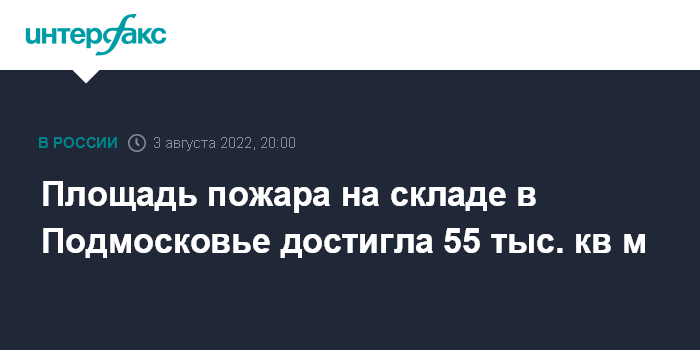 Москва. 3 августа. INTERFAX.RU - Площадь пожара на складе интернет-магазина Ozon в подмосковной Истре увеличилась до 55 тыс. кв. метров, сообщили "Интерфаксу" в пресс-службе подмосковного главка МЧС в среду.