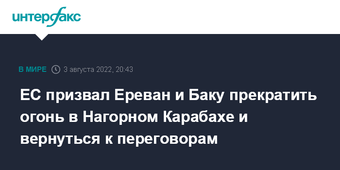 Москва. 3 августа. INTERFAX.RU - Власти ЕС призывают стороны конфликта в Нагорном Карабахе немедленно положить конец боевым действиям и возобновить переговоры, говорится в заявлении европейской внешнеполитической службы.