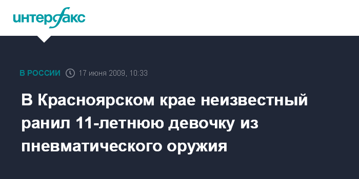 Москва. 17 июня. INTERFAX.RU - Красноярские милиционеры разыскивают неизвестного, ранившего 11-летнюю девочку из пневматического оружия, когда она играла в районе местного стадиона. Как сообщает пресс-служба краевого ГУВД, накануне в поселке Кедровый 11-летняя девочка была доставлена в больницу с проникающим ранением брюшной полости.