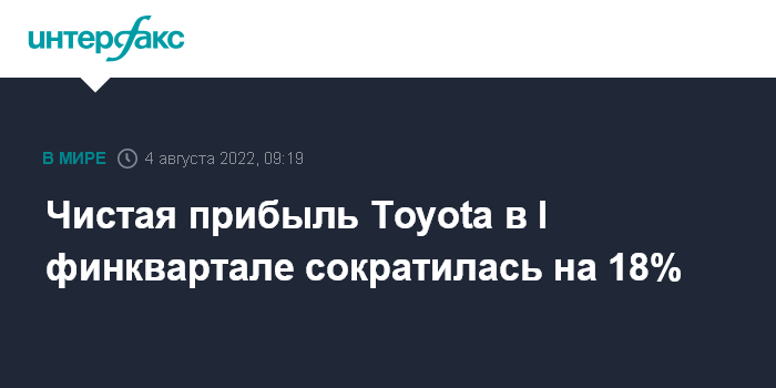 Москва. 4 августа. INTERFAX.RU - Японский автопроизводитель Toyota Motor Corp снизил чистую прибыль на 18% в первом квартале текущего финансового года, хуже прогнозов рынка, однако рост выручки превысил ожидания аналитиков.