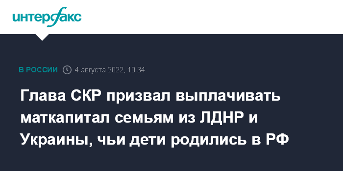 "Очень важно в данном вопросе обратить особое внимание на господдержку молодых семей при рождении детей. Но на данный момент отсутствуют правовые основания для выплат материнского капитала и иных пособий семьям переселенцев, в которых дети родились уже в нашей стране. Это следует урегулировать в самое ближайшее время, закрепив возможность получения таких выплат", - сказал глава СКР в интервью "Интерфаксу" в четверг.