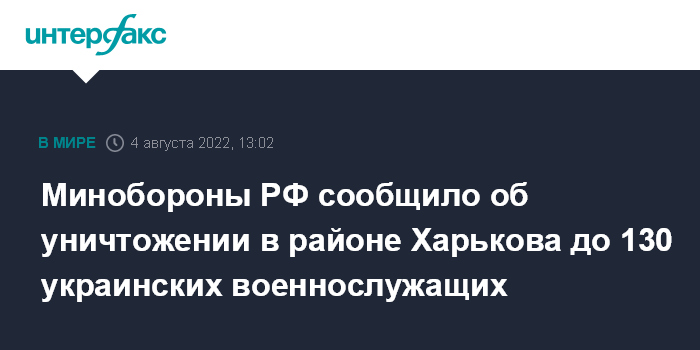 Москва. 4 августа. INTERFAX.RU - Воздушно-космические силы (ВКС) России уничтожили в районе Харькова до 130 украинских военнослужащих и 13 единиц бронетехники, сообщил официальный представитель министерства обороны РФ Игорь Конашенков.