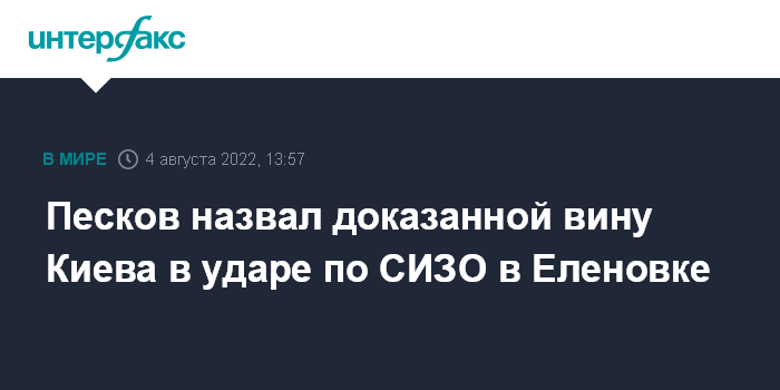 Москва. 4 августа. INTERFAX.RU - Вина Украины в ударе по СИЗО с украинскими военными в Еленовке очевидна и доказана, заявил на брифинге пресс-секретарь президента России Дмитрий Песков.