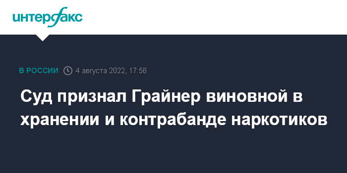 Москва. 4 августа. INTERFAX.RU - Химкинский городской суд вынес обвинительный приговор двукратной олимпийской чемпионке по баскетболу американке Бриттни Грайнер за хранение и контрабанду наркотических средств, передает корреспондент "Интерфакса" из зала суда в четверг.