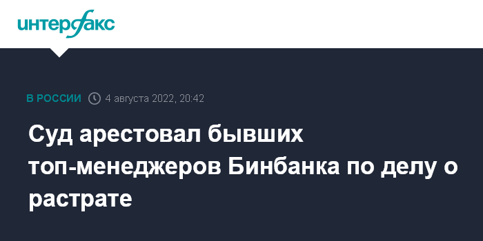 Москва. 4 августа. INTERFAX.RU - Пресненский суд Москвы арестовал до 2 октября бывших топ-менеджеров Бинбанка Кирилла Любенцова и Александра Лукина, подозреваемых в особо крупной растрате (ч.4 ст.160 УК) сообщили "Интерфаксу" в суде.