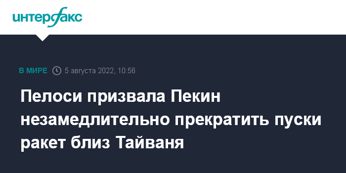 Москва. 5 августа. INTERFAX.RU - Спикер Палаты представителей США Нэнси Пелоси заявила, что Пекину следует "незамедлительно" прекратить пуски ракет близ Тайваня, сообщает портал Axios.