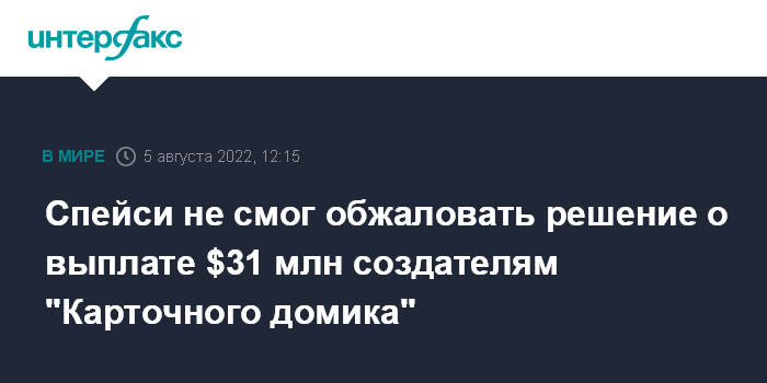 Москва. 5 августа. INTERFAX.RU - Суд Лос-Анджелеса отклонил апелляцию актера Кевина Спейси на решение о выплате $31 млн продюсерской компании Media Rights Capital, выпускавшей сериал "Карточный домик". Об этом сообщает Associated Press.
