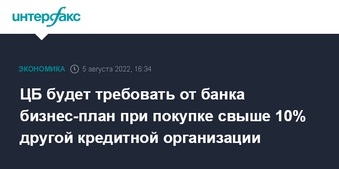 Москва. 5 августа. INTERFAX.RU - ЦБ РФ будет требовать от банка предоставить бизнес-план при покупке свыше 10% акций или долей в другой кредитной организации.