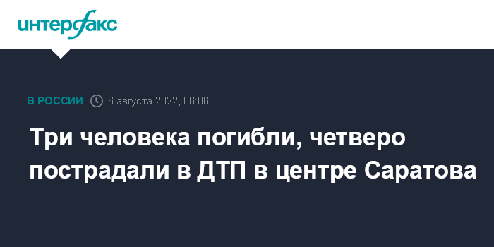 Москва. 6 августа. INTERFAX.RU - Дорожная авария в Саратове унесла жизнь трех человек, еще четверо госпитализированы, написал в своем телеграм-канале глава регионального Минздрава Олег Костин.