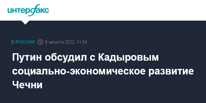 Москва. 6 августа. INTERFAX.RU - Президент РФ Владимир Путин после переговоров со своим турецким коллегой Тайипом Эрдоганом провел встречу с главой Чечни Рамзаном Кадыровым, обсудили социально-экономическое развитие Чечни, сообщил пресс-секретарь российского лидера Дмитрий Песков.