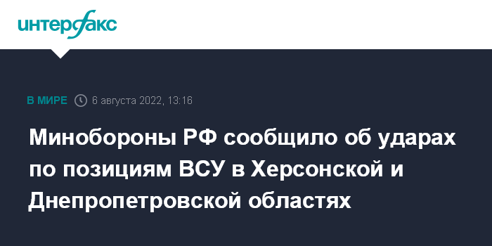 Москва. 6 августа. INTERFAX.RU - Министерство обороны России заявило об уничтожении более 500 украинских военных и иностранных наемников в результате ударов по позициям Вооруженных сил Украины (ВСУ) в Херсонской и Днепропетровской областях.