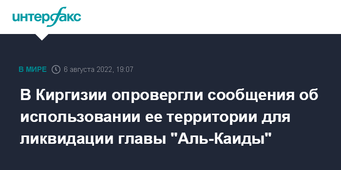 Москва. 6 августа. INTERFAX.RU - Министерство иностранных дел Киргизии назвало ложной информацию пакистанских СМИ о ликвидации главы "Аль-Каиды" (запрещенная в РФ террористическая организация) Аймана аз-Завахири ударами с беспилотного летательного аппарата, запущенного с киргизской территории.