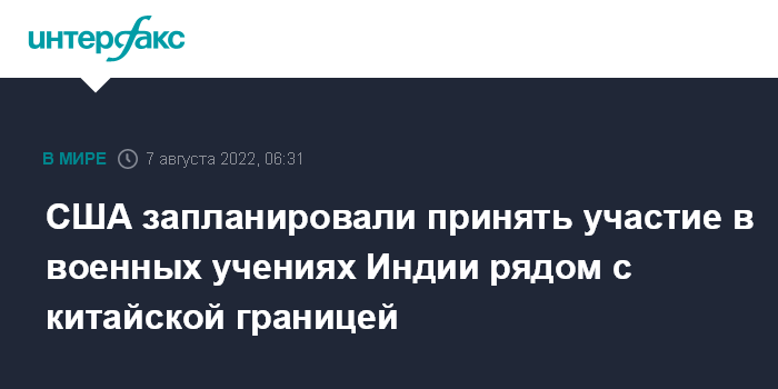 Москва. 7 августа. INTERFAX.RU - США планирует отправить военных для участия в учениях Индии "Военная практика", которые пройдут в районе Аули, индийского штата Уттаракханд, примерно в 95 км от линии фактического контроля, выполняющей роль границы с Китаем, сообщил телеканал CNN.