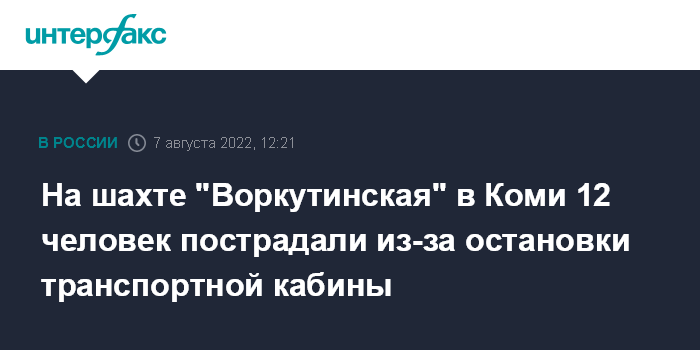 Москва. 7 августа. INTERFAX.RU - Экстренная остановка клети (транспортной кабины) произошла на шахте "Воркутинская" в воскресенье утром, пострадали 12 человек, сообщает пресс-служба АО "Воркутауголь" на своей странице ВКонтакте.